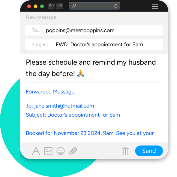 Forward your emails and texts to Poppins. Poppin's AI will pull out the important bits, add them to your calendar, create reminders, and notify your partner of new events.